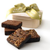A cozy gift basket that will make a small birthday party memorable. Not too little, not to much. Our Happy Birthday Brownie Nibbler is just the right amount of our delicious brownies for one person. Each gift contains 4 individually wrapped brownies in our two most popular flavors: rich and fudgy Chocolate Chunk and decadent Caramel Pecan. The perfect gift for a co-worker or just a little something to brighten someone's birthday. Arrives in a wooden shaker-style box tied with a Happy Birthday printed ribbon. All our products are scratch-baked using all natural ingredients without preservatives, and packaged in recycled material.