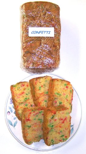 Our Confetti Cake is made with real eggs, and rainbow jimmies mixed in the batter. The Loafs are 7" long, and freshly baked and shipped the same day. Also you can include a gift message.