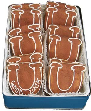 Horseshoes are an international symbol for good luck. Wish them the best by sending these lucky unique gourmet sugar cookie horseshoes to show your support. A great gift baskets ideas for men, women, kids, or any occasion. As seen on the Food Network! Fo