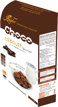 Organic Choco Biscuits Sprouted.To make your important meal more colorful and valuable.We produce by a careful selection of healthy natural ingredients.Chocolate in 8 organic whole grains cereal flakes(Job's Tears,Lotus seed,Mung Bean,Soy bean,Brown Rice,Hom-Nin Rice and Corn).Agood source of fibers and vitamins.Mixed with cheerful Sprouted rice-an excellent source of GABA from organic Thai farmers.